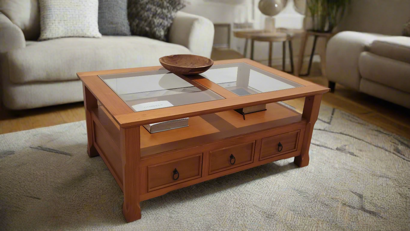 This elegant pine coffee table features two glass panels and three drawers, making it an ideal addition to any lounge or sitting area.